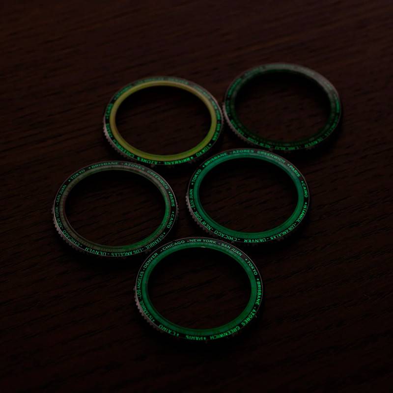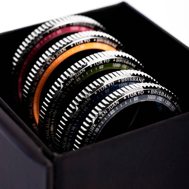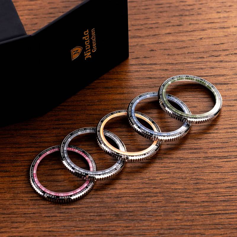 Nivada Grenchen est une marque de montres suisse qui propose aujourd'hui un jeu de lunettes interchangeables vous permettant de changer de style en fonction de votre humeur sans compromettre la belle esthétique de votre montre. Flexibles et personnalisables, ces lunettes crantées permettent aux utilisateurs d'adapter facilement leur montre à différentes tenues ou occasions. Elles sont conçues en acier inoxydable 316L poli et disposent d'inserts en plexiglas. Une fois associées à votre garde-temps, elle changeront son style pour une plus belle allure. Au nombre de cinq, elles sont proposées en noir, orange, gris, rose, bleu et vert et présentent la graduation des noms des villes (Azores, Greenwich, Paris, Le Caire, Istanbul, Los Angeles, Denver, Chicago, New York, San Juan, Brisbane) recouvertes de Super-LumiNova blanc. Ces lunettes unidirectionnelles seront compatibles avec les modèles Chronoking dont le diamètre est de 39 mm.