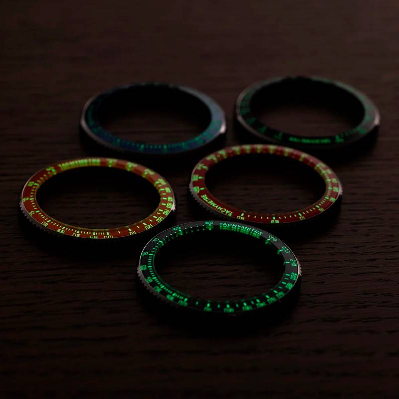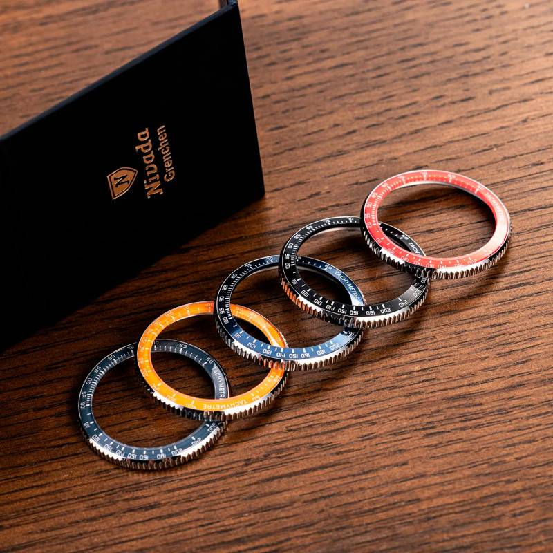 La marque horlgère Nivada Grenchen présente ce superbe jeu de cinq lunettes personnalisables. Réalisées en acier inoxydable 316L poli, elles disposent d'inserts en plexiglas. Ces lunettes crantées permettent aux utilisateurs d'adapter sans effort leur montre à différentes tenues ou occasions. Cette collection de cinq lunettes bicolores interchangeables est disponible en jaune, rouge, noir, grise ou bleu. Elles dévoilent la graduation d'une échelle tachymétrique qui permet de déterminer la vitesse de déplacement d'un objet en mouvement. Ces lunettes unidirectionnelles seront compatibles avec les garde-temps Chronoking dont le diamètre est de 39 mm.