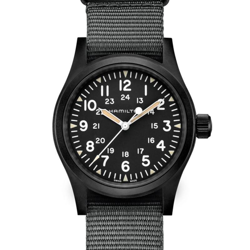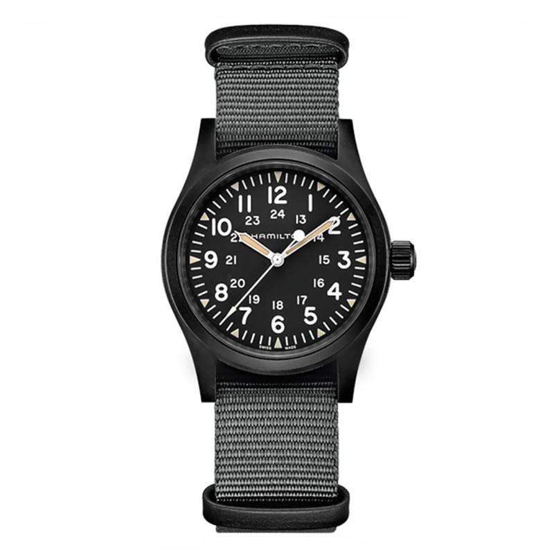 Voici un superbe modèle Khaki Field Mechanical présenté par la maison horlogère Américaine Hamilton. Véritable modèle iconique de la marque, il a su se réinventer pour rester au goût du jour. Mélant précision suisse et esprit américain, cette montre arbore un boîtier en acier inoxydable PVD noir affichant un diamètre de 38mm pour une épaisseur de 9.5mm, idéal pour un poignet masculin. Afin de préserver l'éclat du cadran au fil des années, ce dernier s'équipe d'un verre Saphir résistant face aux rayures et autres chocs de la vie quotidienne. C'est au niveau de l'index de trois heures que vous retrouverez une couronne crantée qui se montrera utile lors de votre réglage de l'heure et pour effectuer votre remontage manuellement. Son fond de boîte vissé vous garantit une étanchéité de 5 atmosphères.