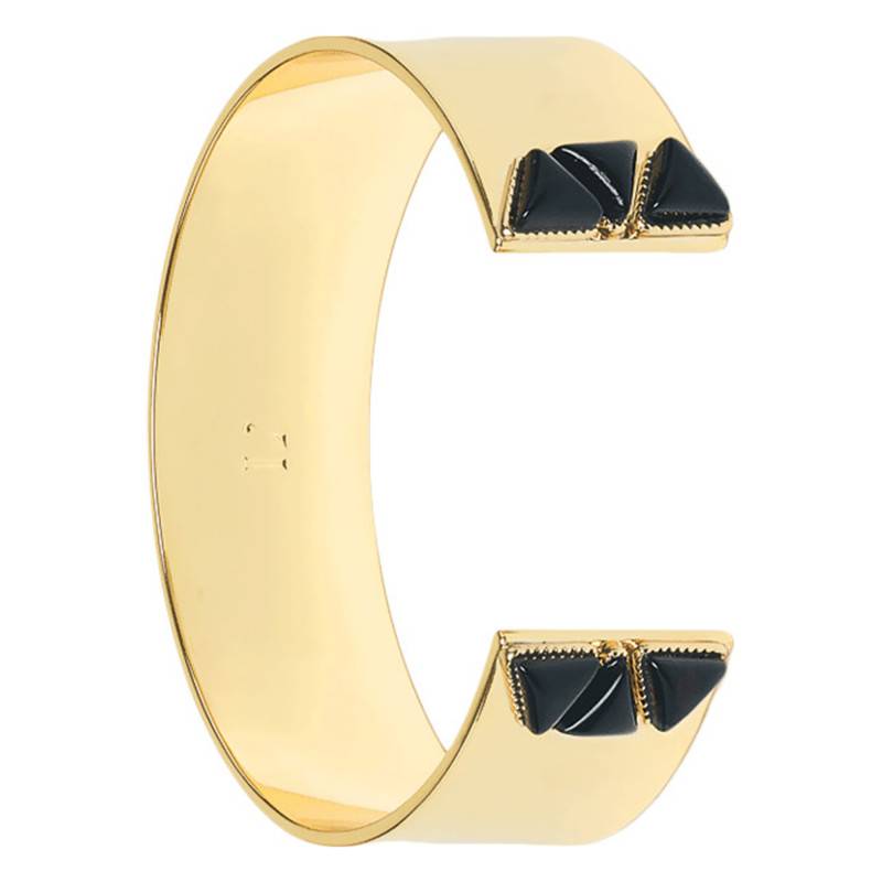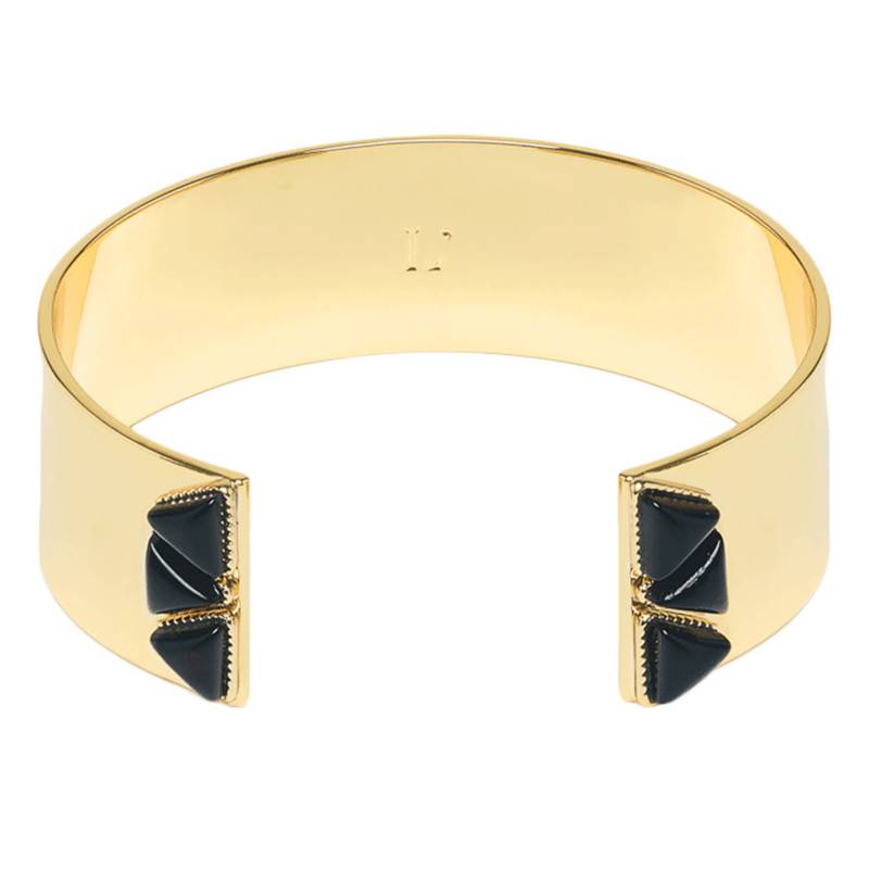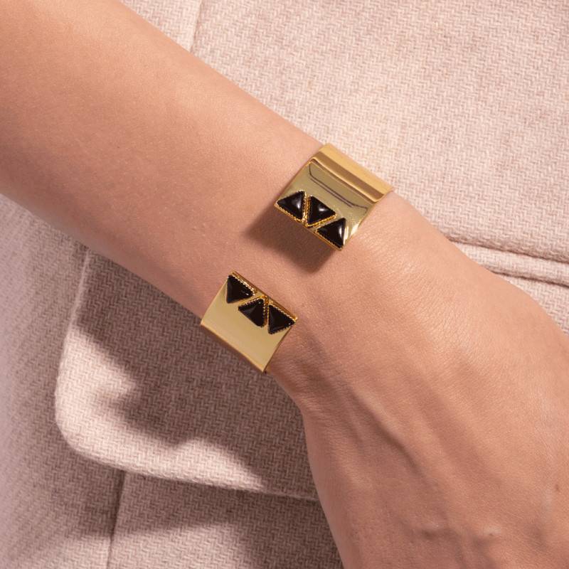 Craquez pour la manchette Lina, composé de laiton doré. Cette manchette possède également des pierres onyx aux motifs géométries. D'une largeur de 19 mm, elle possède une longueur que vous pourrez ajuster (entre 14 et 17 cm).