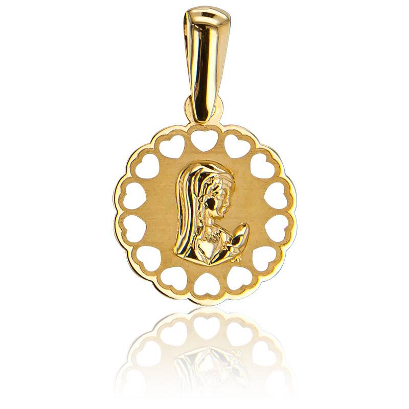 De forme ronde, cette délicate médaille en or 375/1000 (9K) de la maison Vandona affiche un motif central en hommage à la Vierge Marie en Prière. Celle-ci s'entoure d'un contour finement ajouré composé de coeurs. L'effet sablé confère un aspect visuel mat à l'ensemble et le contour poli sont autant de facteurs sublimant le motif central. De plus vous apprécierez les jolis reflets dorés dû à sa composition en or jaune .