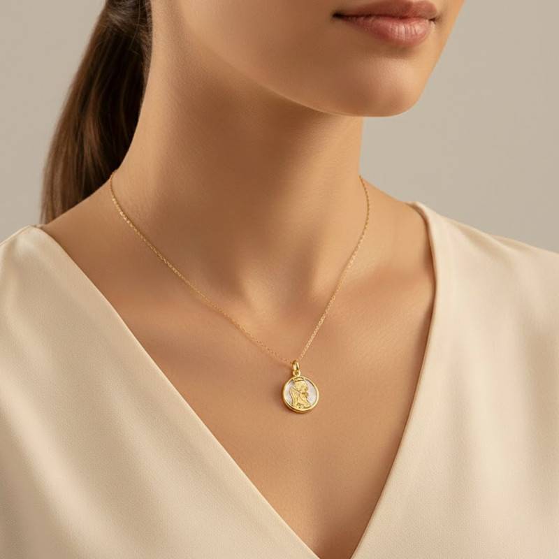 Laissez-vous séduire par cette délicate Médaille Ange en Prière. Confectionnée en or jaune 375 et réhaussée de nacre, elle illumine votre décolleté d'une lumière divine. Son fini poli et brillant évoque la douceur et la pureté. Avec un diamètre de 14,50 mm et une épaisseur de 1,40 mm, elle se porte comme un délicat trésor de lumière. D'un poids subtil de 0,81 g, elle s'impose par sa légèreté et son élégance.