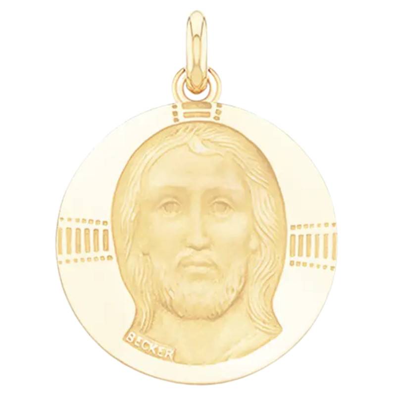La maison Becker vous présente son modèle du Christ Byzantin. Cette médaille ronde sablée en or jaune 750/1000 (18K) représente le Christ Byzantin. On parle du Christ en gloire, en opposition aux représentations plus humaines du Christ souffrant sur le crucifix.