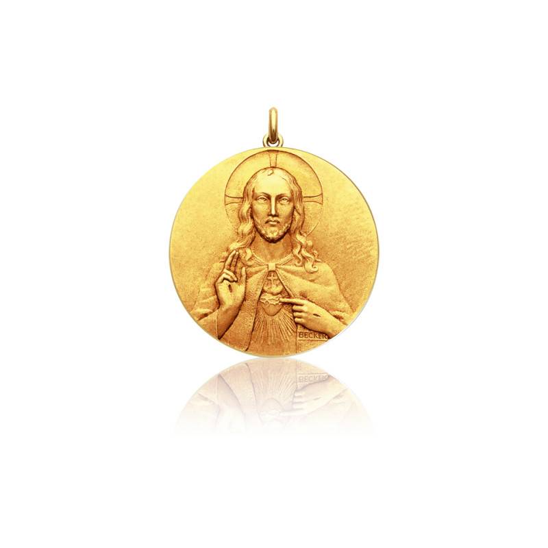 Cette médaille ronde en or jaune 750/1000 (18K) est à l'effigie du Christ. On y retrouve celui-ci de face, auréolé et pointant du doigt son cœur. Le Sacré-Cœur étant un symbole d'amour, par lequel Jésus a sacrifié sa vie pour les hommes. Avec le haut du crâne illuminé, Jésus semble disposer d'une aura sainte. De plus, le contraste entre le haut de la médaille clair et le bas plus foncé rappelle l'appel de la lumière des cieux. En relief et finement travaillée, cette médaille est apposée du nom de la maison Becker sur sa partie droite. Voilà donc un présent fort et unique à offrir pour tous évènements religieux.