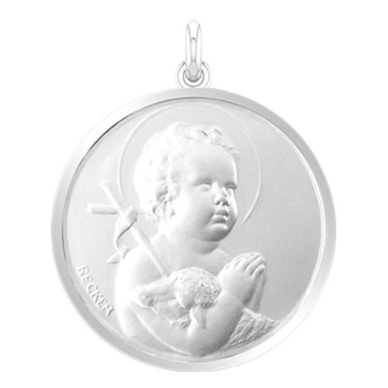 Délicate médaille de berceau de la marque Becker composée en argent massif, d'un diamètre de 50 mm. La bélière de cette médaille est de forme ovale.