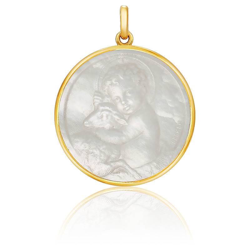 Cette médaille ronde en nacre et entourage en or jaune 750/1000 (18K) représente Jésus et la brebis.