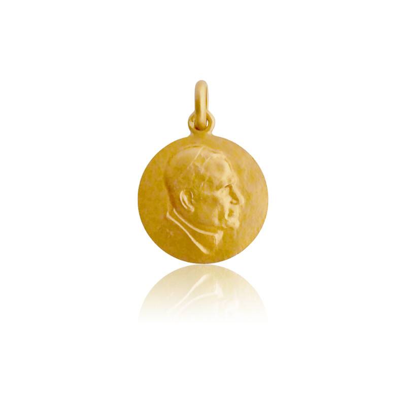 La maison Becker vous propose cette médaille de forme ronde en or jaune 750/1000 (18K) à l'effigie de Jean Paul II. Karol Józef Wojtyła est un prêtre polonais, élu pape de l'Église catholique romaine le 16 octobre 1978 sous le nom de Jean-Paul II. Il fut l'ardent défenseur des réformes du Concile Vatican II, auquel il participa très activement en tant qu'évêque. Sa volonté de défense de la dignité humaine l'a conduit à promouvoir les Droits de l'homme. Il s'est opposé à l'idéologie communiste et a favorisé la chute du bloc de l'Est. Il a également dénoncé les excès du capitalisme.