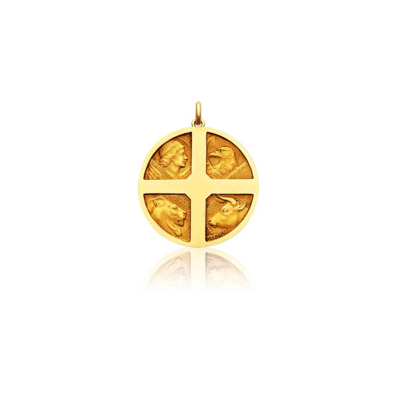 Cette médaille ronde en or jaune 750/1000 (18K) représente Les 4 Evangélistes. Elle possède deux finitions distinctes. La première est une finition polie sur le fond de la médaille et se trouve donc visible sur la croix au centre. Le reste est une finition sablée pour mettre en relief les détails.