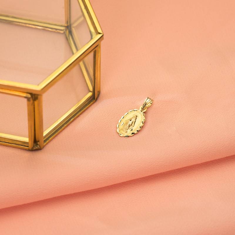 Cette belle médaille vierge miraculeuse aux bords ondulés et facettés. Elle présente une forme ovale de 12 mm de hauteur et 9 mm de largeur. Son recto est rehaussé par une représentation épurée de la vierge Marie les mains ouvertes et debout sur un globe avec l'inscription “O Marie conçue sans péchés, priez pour nous qui avons recours à vous !”en espagnol. Au verso, sont placés douze étoiles, les saints cœurs de Marie et Jésus, la lettre “M”, une barre transversale et une croix. Le tout est sublimé par une finition polie pour un rendu brillant et intemporel. Fabriquée en or jaune dotée d'une bélière ovale. Elle est disponible en or 375/1000 (9K) et en or 750/1000 (18K). Son poids moyen sera respectivement de 0,54 gramme et 0,58 gramme.