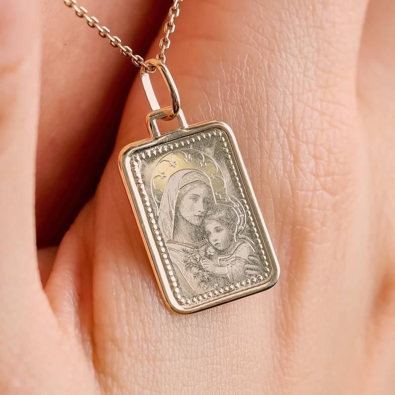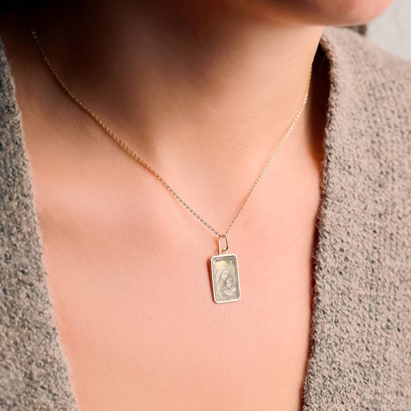 Cette délicate médaille vierge à l'enfant se distingue par son design à la fois classique et son style intemporel. Elle prend une forme rectangulaire de 13 mm de largeur pour 0,50 mm d'épaisseur et 26 mm de hauteur, y compris la bélière. Sa conception en or jaune 375/1000 (9K) et sa finition polie lui accorde cette brillance dorée saisissante qui se reflétera sur le cou de celui ou celle la portant. Cette médaille incarne l'amour maternel dans son plus bel état. Elle dévoile sur sa surface une représentation de la Vierge Marie avec l'enfant Jésus cajolé dans ses bras et portant entre ses mains des fleurs. Les saints sont entourés par deux auréoles texturées et sont encadrés par un design perlé. À offrir ou à s'offrir, cette belle médaille est le bijou qu'il vous faut pour une célébration unique. Son poids d'or moyen fait 0,42 gramme et la bélière ovale qui l'accompagne permet de la glisser aisément sur une chaîne.