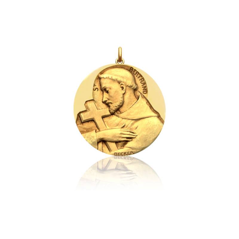 Médaille en or jaune 750/1000 (18K), effet sablé représentant Saint Bertrand. Cette médaille possède deux finitions distinctes. Premièrement, nous avons une finition polie sur le fond de la médaille pour apporter brillance et éclat. La deuxième finition est une finition sablée appliquée sur le Saint afin de se différencier du fond de la médaille polie.
