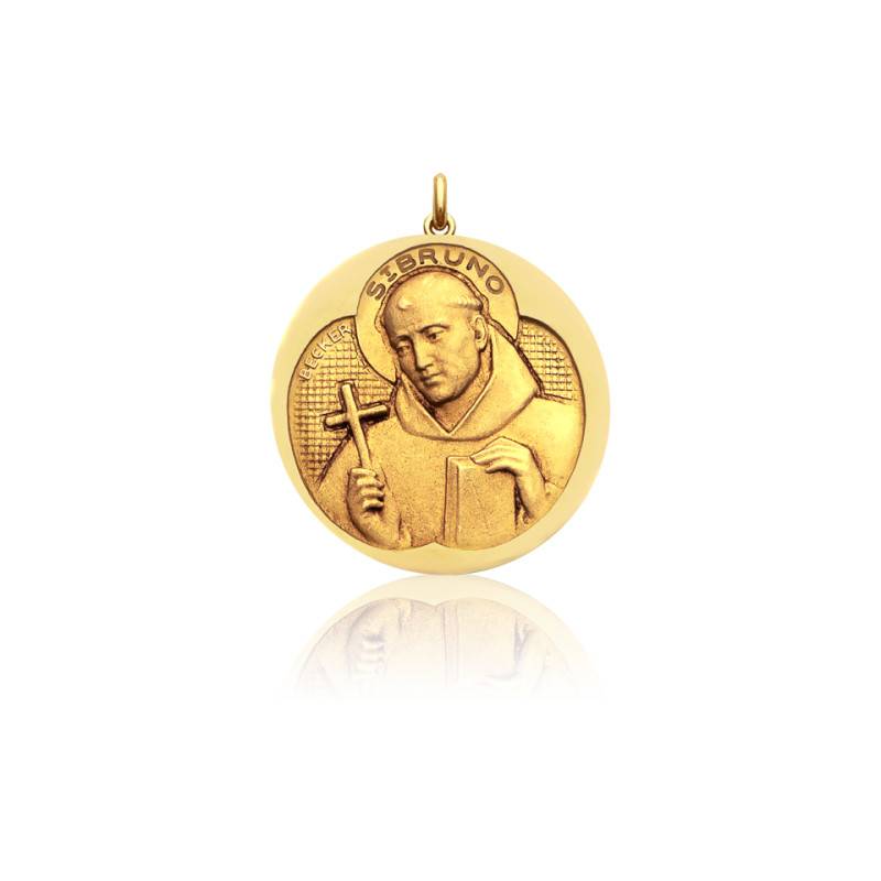 Médaille en or jaune 750/1000 (18K), effet sablé représentant Saint Bruno. Cette médaille possède deux finitions distinctes. Premièrement, nous avons une finition polie sur le fond de la médaille pour apporter brillance et éclat. La deuxième finition est une finition sablée appliquée sur le Saint afin de se différencier du fond de la médaille polie.