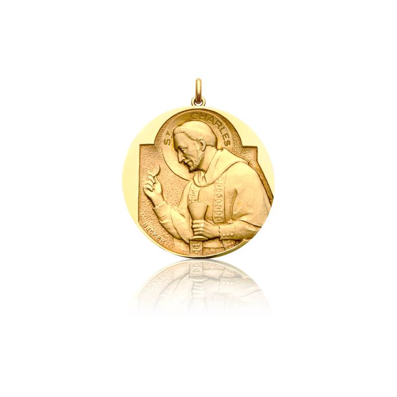 Médaille en or jaune 750/1000 (18K), effet sablé représentant Saint Charles. Cette médaille possède deux finitions distinctes. Premièrement, nous avons une finition polie sur le fond de la médaille pour apporter brillance et éclat. La deuxième finition est une finition sablée appliquée sur le Saint afin d'apporter une nuance.