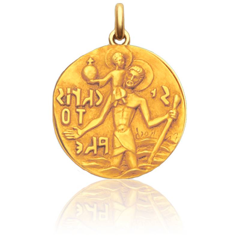 Cette médaille ronde au style primitif en or jaune 750/1000 (18K) représente Saint Christophe et l'Enfant Jésus.