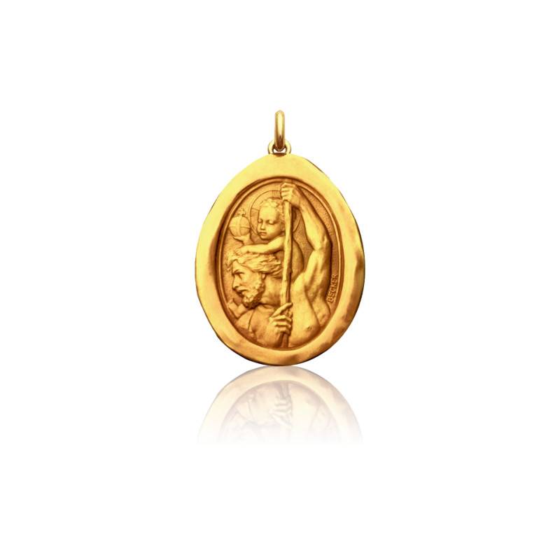 De forme ovale, cette médaille de la maison Becker en or jaune 750/1000 (18K) est à l'effigie de Saint Christophe. La finition sablée de l'ensemble sublime le motif.