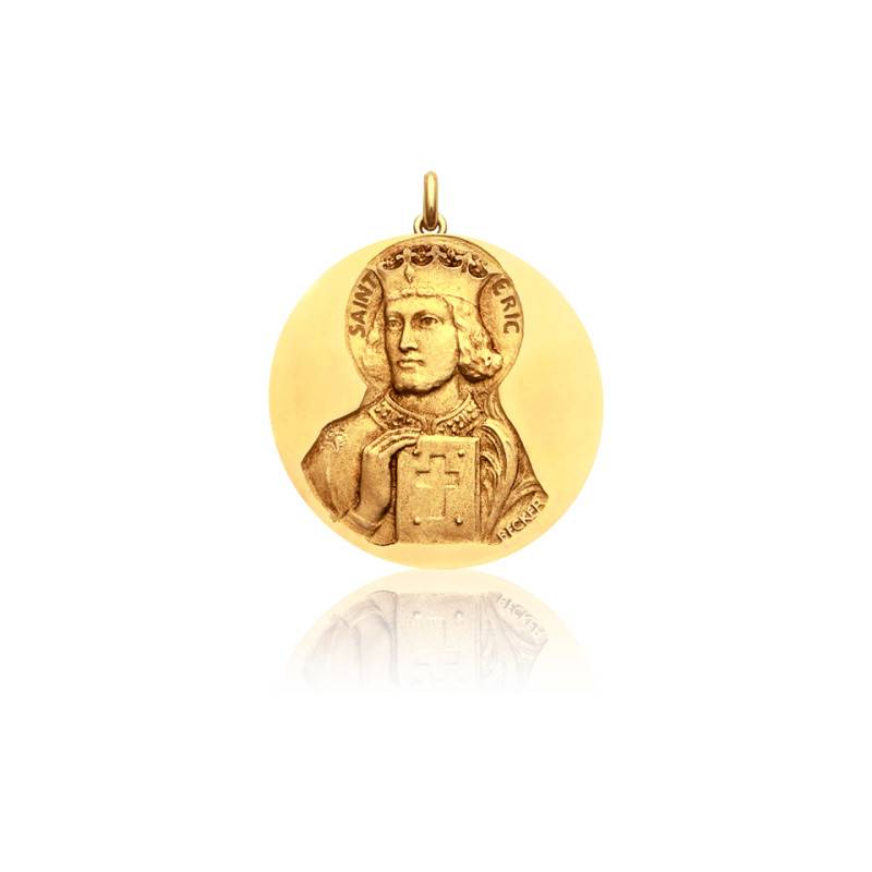 Médaille en or jaune 750/1000 (18K) représentant Saint Eric. Cette médaille possède deux finitions distinctes. Premièrement, nous avons une finition polie sur le fond de la médaille pour apporter brillance et éclat. La deuxième finition est une finition sablée appliquée sur le Saint afin de se différencier du fond de la médaille polie.