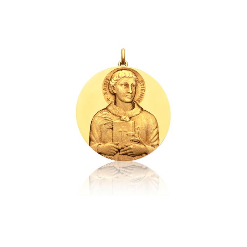 Médaille en or jaune 750/1000 (18K), effet sablé représentant Saint Etienne. Cette médaille possède deux finitions distinctes. Premièrement, nous avons une finition polie sur le fond de la médaille pour apporter brillance et éclat. La deuxième finition est une finition sablée appliquée sur le Saint afin de se différencier du fond de la médaille polie.