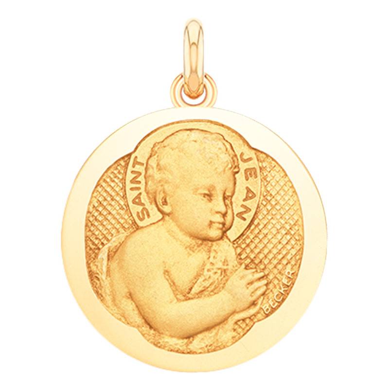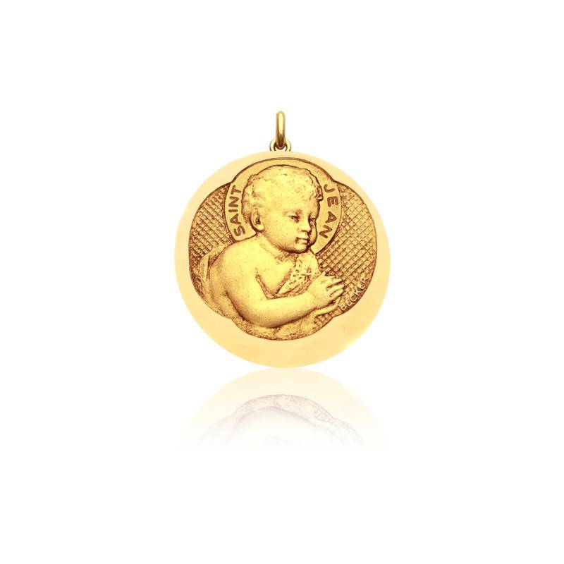 Médaille en or jaune 750/1000 (18K),effet sablé représentant Saint Jean. Cette médaille possède deux finitions distinctes. Premièrement, nous avons une finition polie sur le fond de la médaille pour apporter brillance et éclat. La deuxième finition est une finition sablée appliquée sur le Saint afin de se différencier du fond de la médaille polie.