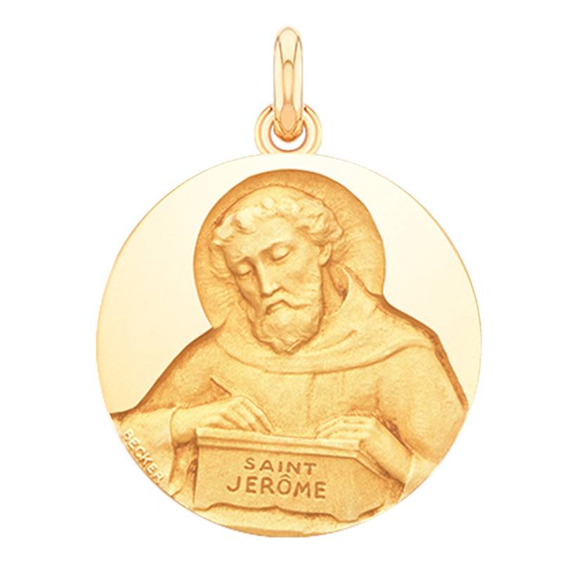 Médaille en or jaune 750/1000 (18K), effet sablé représentant Saint Jérôme. Cette médaille possède deux finitions distinctes. Premièrement, nous avons une finition polie sur le fond de la médaille pour apporter brillance et éclat. La deuxième finition est une finition sablée appliquée sur le Saint afin de se différencier du fond de la médaille polie.