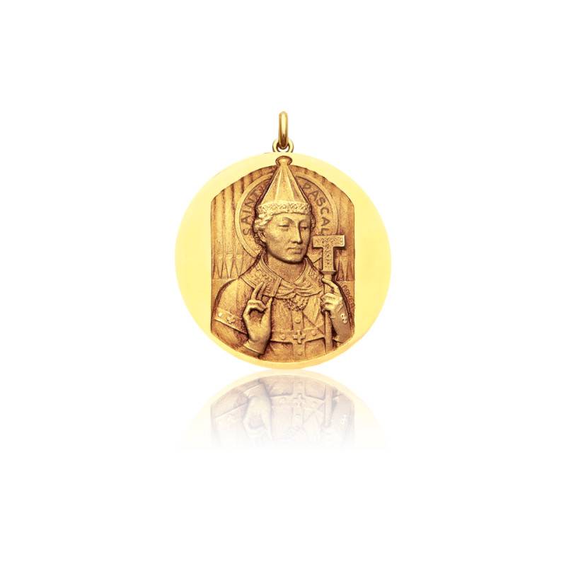 Médaille en or jaune 750/1000 (18K), effet sablé représentant Saint Pascal. Cette médaille possède deux finitions distinctes. Premièrement, nous avons une finition polie sur le fond de la médaille pour apporter brillance et éclat. La deuxième finition est une finition sablée appliquée sur le Saint afin de se différencier du fond de la médaille polie.