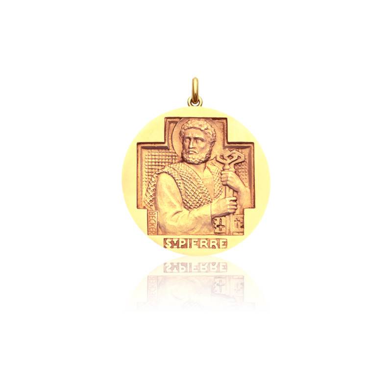 Médaille en or jaune 750/1000 (18K), effet sablé représentant Saint Pierre. Cette médaille possède deux finitions distinctes. Premièrement, nous avons une finition polie sur le fond de la médaille pour apporter brillance et éclat. La deuxième finition est une finition sablée appliquée sur le Saint afin de se différencier du fond de la médaille polie.