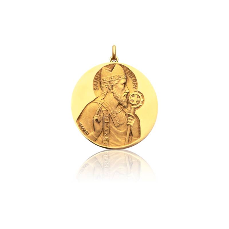Médaille en or jaune 750/1000 (18K), effet sablé représentant Saint Thierry. Cette médaille possède deux finitions distinctes. Premièrement, nous avons une finition polie sur le fond de la médaille pour apporter brillance et éclat. La deuxième finition est une finition sablée appliquée sur le Saint afin de se différencier du fond de la médaille polie.