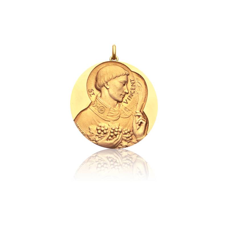 Médaille en or jaune 750/1000 (18K), effet sablé représentant Saint Vincent. Cette médaille possède deux finitions distinctes. Premièrement, nous avons une finition polie sur le fond de la médaille pour apporter brillance et éclat. La deuxième finition est une finition sablée appliquée sur le Saint afin de se différencier du fond de la médaille polie.