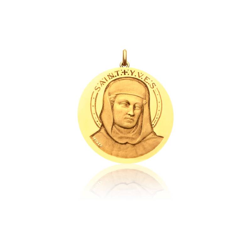 Médaille en or jaune 750/1000 (18K), effet sablé représentant Saint Yves. Cette médaille possède deux finitions distinctes. Premièrement, nous avons une finition polie sur le fond de la médaille pour apporter brillance et éclat. La deuxième finition est une finition sablée appliquée sur le Saint afin de se différencier du fond de la médaille polie.