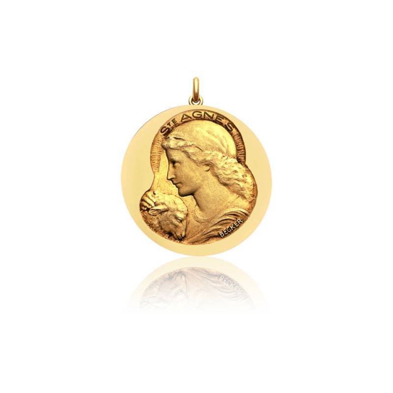 Médaille en or jaune 750/1000 (18K) représentant Sainte Agnès. Cette médaille possède deux finitions distinctes. Premièrement, nous avons une finition polie sur le fond de la médaille pour apporter brillance et éclat. La deuxième finition est une finition sablée appliquée sur Saint Agnès afin de se différencier du fond de la médaille polie.