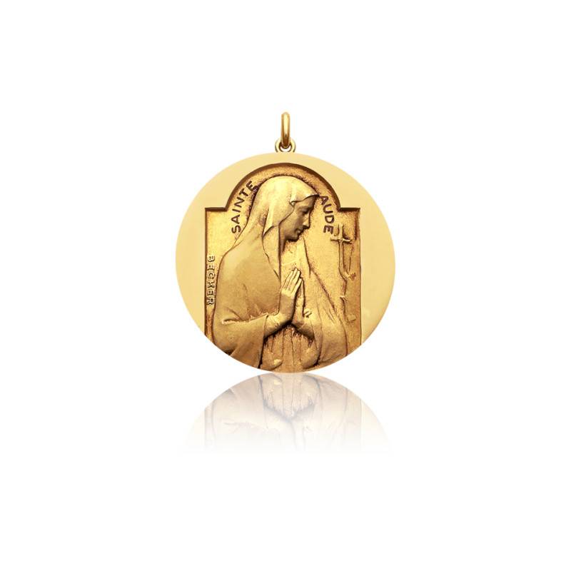 Médaille en or jaune 750/1000 (18K) représentant Sainte Aude. Cette médaille possède deux finitions distinctes. Premièrement, nous avons une finition polie sur le fond de la médaille pour apporter brillance et éclat. La deuxième finition est une finition sablée appliquée sur Sainte Aude afin de se différencier du fond de la médaille polie.