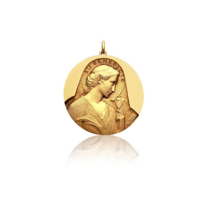 Médaille en or jaune 750/1000 (18K) représentant Sainte Bénédicte. Cette médaille possède deux finitions distinctes. Premièrement, nous avons une finition polie sur le fond de la médaille pour apporter brillance et éclat. La deuxième finition est une finition sablée appliquée sur Sainte Bénédicte afin de se différencier du fond de la médaille polie.