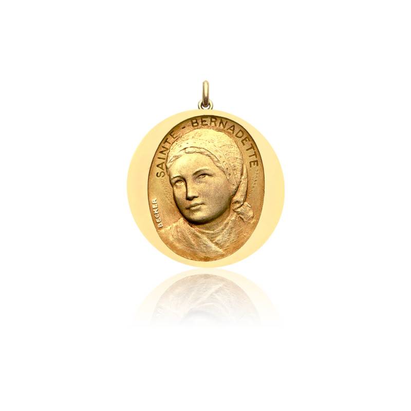 Médaille en or jaune 750/1000 (18K) représentant Sainte Bernadette. Cette médaille possède deux finitions distinctes. Premièrement, nous avons une finition polie sur le fond de la médaille pour apporter brillance et éclat. La deuxième finition est une finition sablée appliquée sur Sainte Bernadette afin de se différencier du fond de la médaille polie.
