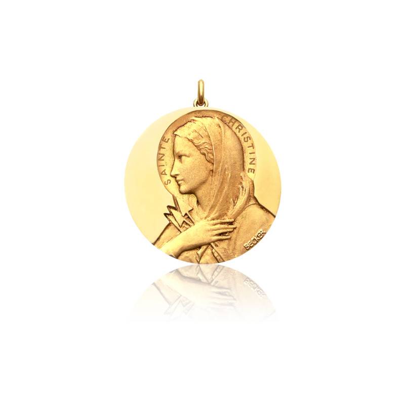 Médaille en or jaune 750/1000 (18K) représentant Sainte Christine. Cette médaille possède deux finitions distinctes. Premièrement, nous avons une finition polie sur le fond de la médaille pour apporter brillance et éclat. La deuxième finition est une finition sablée appliquée sur Sainte Christine afin de se différencier du fond de la médaille polie.