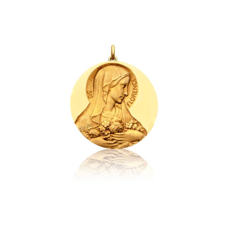 Médaille en or jaune 750/1000 (18K) représentant Sainte Florence. Cette médaille possède deux finitions distinctes. Premièrement, nous avons une finition polie sur le fond de la médaille pour apporter brillance et éclat. La deuxième finition est une finition sablée appliquée sur Sainte Florence afin de se différencier du fond de la médaille polie.