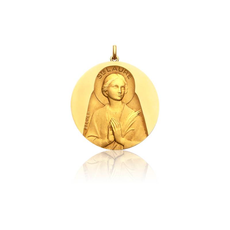 La maison Becker vous propose ici une médaille de forme ronde conçue en or jaune 750/1000 (18K) à l'effigie de Sainte Laure. En 864, Sainte Laure, chrétienne, est martyr des sarrasins à Cordoue car elle refuse de se convertir à l'islam. Son prénom vient du latin « laurier » et sa fête est le 19 Octobre. Cette médaille possède deux finitions distinctes. Premièrement, nous avons une finition polie sur le fond de la médaille pour apporter brillance et éclat. La deuxième finition est une finition sablée appliquée sur Sainte Laure afin de se différencier du fond de la médaille polie.