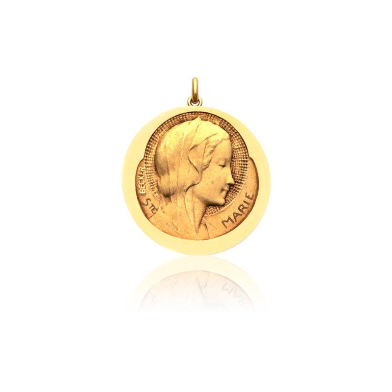 Médaille en or jaune 750/1000 (18K) représentant Sainte Marie. Cette médaille possède deux finitions distinctes. Premièrement, nous avons une finition polie sur le fond de la médaille pour apporter brillance et éclat. La deuxième finition est une finition sablée appliquée sur Sainte Marie afin de se différencier du fond de la médaille polie.