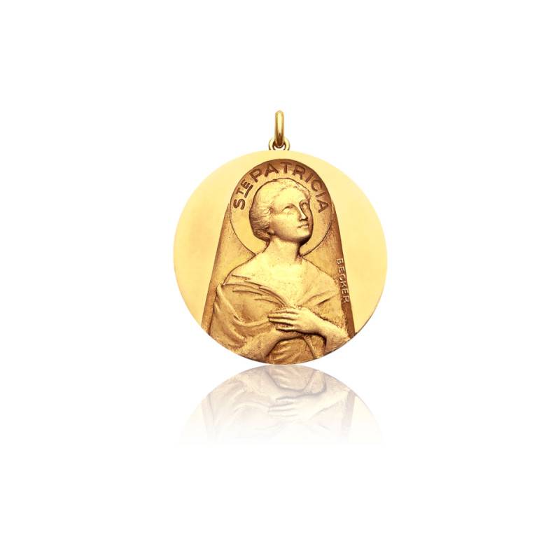 Médaille de forme ronde conçue en or jaune 750/1000 (18K) à l'effigie de Sainte Patricia. Son prénom vient du latin « patricien » et sa fête est le 13 Mars. Jeune romaine de Nicomédie (Asie Mineure), Patricia est une parente de l'empereur Dioclétien lorsque celui-ci ordonne la célèbre persécution des Chrétiens en 303. Elle choisit tout de même de se convertir au christianisme et doit donc fuir sa ville. Elle se rend alors à Rome où elle se joint à des femmes retirées dans un monastère. Après l'édit de Milan promulgué par Constantin en 313, qui accorde aux Chrétiens la libre pratique de leur culte, Patricia décide de faire un pèlerinage en Terre Sainte. Elle rend son dernier souffle en rentrant en Italie, sans doute vers 330-340.