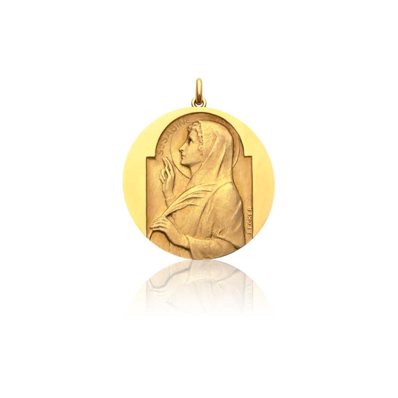 Conçue en or jaune 750/1000 (18K), cette médaille de forme ronde est à l'effigie de Sainte Sabine. Cette médaille possède deux finitions distinctes. Premièrement, nous avons une finition polie sur le fond de la médaille pour apporter brillance et éclat. La deuxième finition est une finition sablée appliquée sur Sainte Sabine afin de se différencier du fond de la médaille polie.