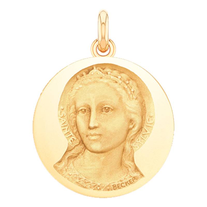 Issue des collections de la maison Becker, cette médaille à l'effigie de Sainte Sylvie se compose d'or jaune 750/1000 (18K). Cette médaille possède deux finitions distinctes. Premièrement, nous avons une finition polie sur le fond de la médaille pour apporter brillance et éclat. La deuxième finition est une finition sablée appliquée sur Saint Sylvie afin de se différencier du fond de la médaille polie.