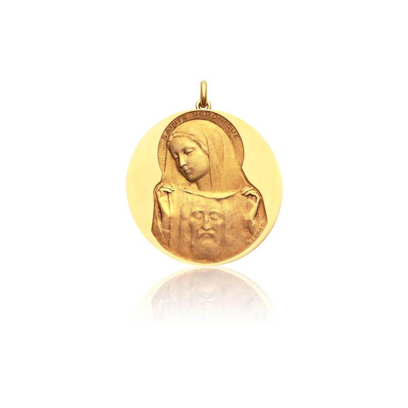 Médaille en or jaune 750/1000 (18K), effet sablé représentant Sainte Véronique. Cette médaille possède deux finitions distinctes. Premièrement, nous avons une finition polie sur le fond de la médaille pour apporter brillance et éclat. La deuxième finition est une finition sablée appliquée sur Sainte Véronique afin de se différencier du fond de la médaille polie.