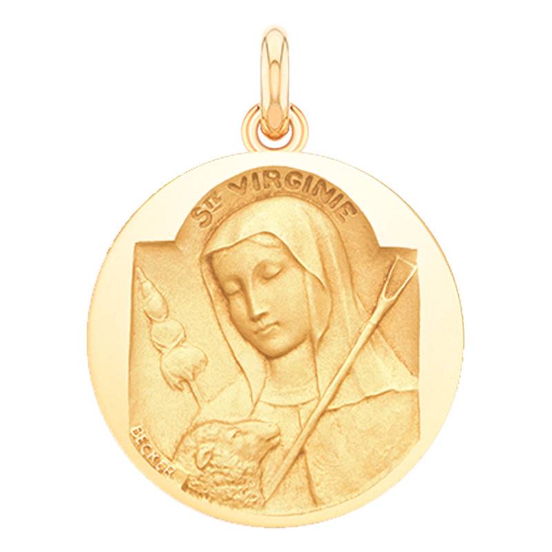 Médaille en or jaune 750/1000 (18K), effet sablé représentant Sainte Virginie. Cette médaille possède deux finitions distinctes. Premièrement, nous avons une finition polie sur le fond de la médaille pour apporter brillance et éclat. La deuxième finition est une finition sablée appliquée sur Sainte Virginie afin de se différencier du fond de la médaille polie.