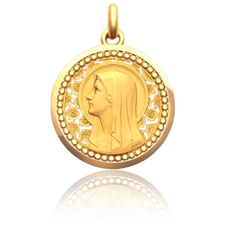 Ravissante médaille ronde et ajourée en or jaune 750/1000 (18K) représentant le doux profil auréolé de la Vierge Marie.