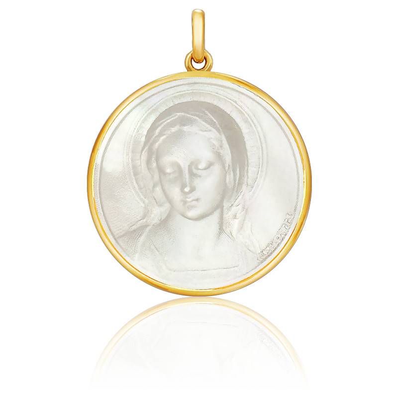 Cette médaille ronde en nacre naturelle et or jaune 750/1000 (18K) possède une fine bélière ovale. A l'effigie de la Vierge Marie, on y retrouve la figure de celle-ci en motif central. La Sainte apparaît de face les yeux fermés avec un visage d'une grande douceur. La noblesse des matériaux utilisés témoigne d'un savoir-faire rare, tout comme la finesse des traits du personnage. Sur le coté droit de la médaille est gravé le terme "Amabilis" pouvant se traduire comme aimable ou "digne d'être aimé".