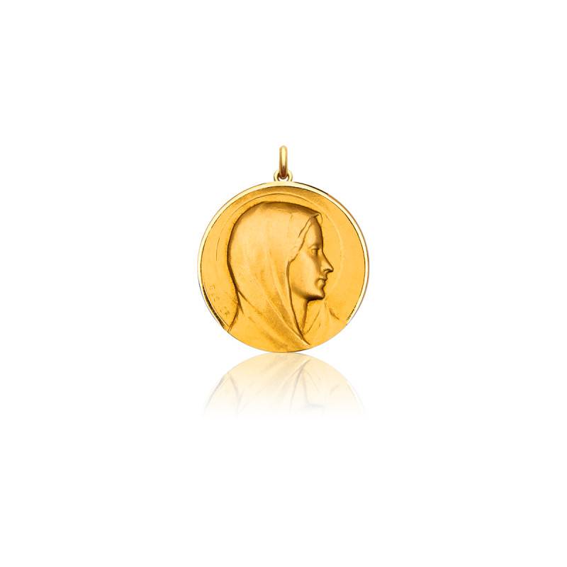 Conçue en or jaune, cette médaille ronde à l'effigie de la Vierge Marie présente de superbes reflets. Au centre on découvre la sainte de profil, fidèle aux représentations de l'art Gothique. Celle-ci s'entoure d'une fine auréole gravée. Vous apprécierez les minutieux détails composant le portrait de Marie, notamment le plissé de son voile lui conférant un effet très réel. C'est une finition sablée qui vient parfaire ce bijou pour un rendu mat tranchant avec le poli des contours. Une petite bélière de forme ronde accompagne cette médaille pour une discrétion totale.