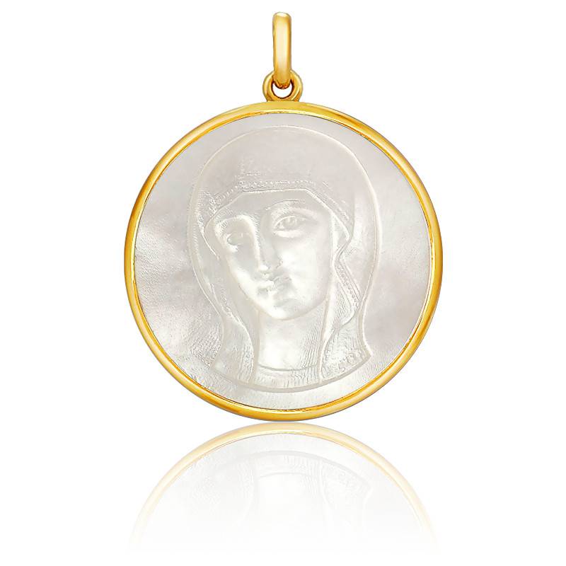 Cette médaille ronde martelée en nacre et entourage en or jaune 750/1000 (18K) représente la Vierge. C'est un cadeau idéal pour une naissance, un baptême ou une communion, avec sa bélière qui s'adapte avec de nombreux types de chaînes.