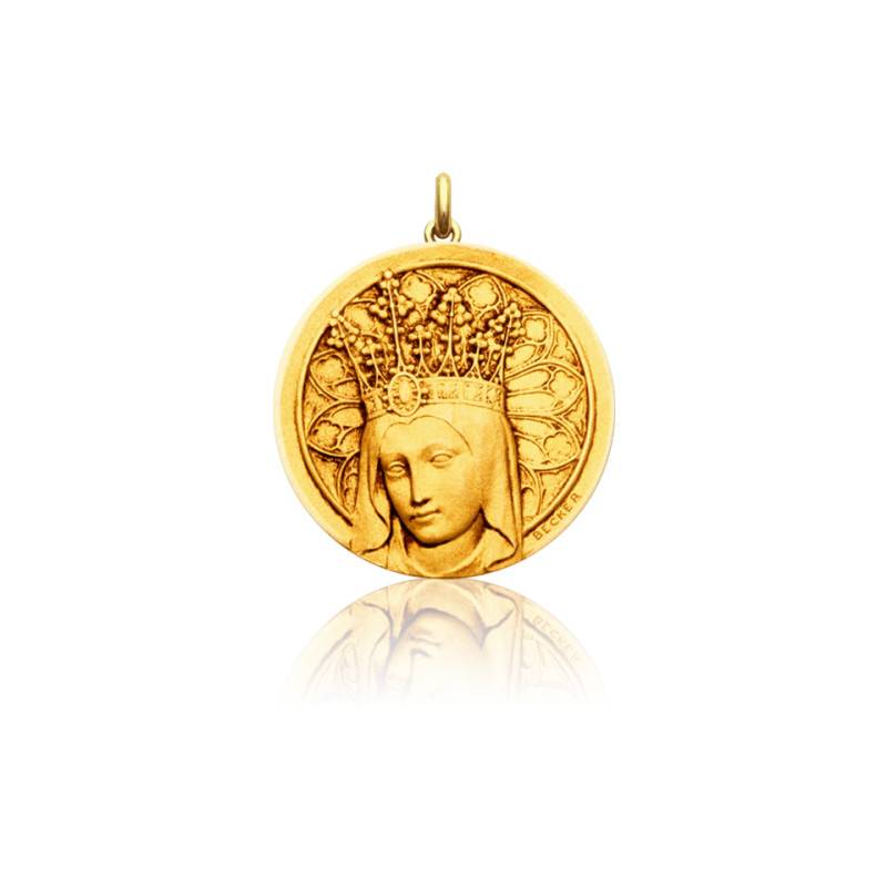 Cette médaille ronde sablée en or jaune 750/1000 (18K) représente la Vierge Couronnée. La Vierge, au visage si doux, est ici présentée de face.