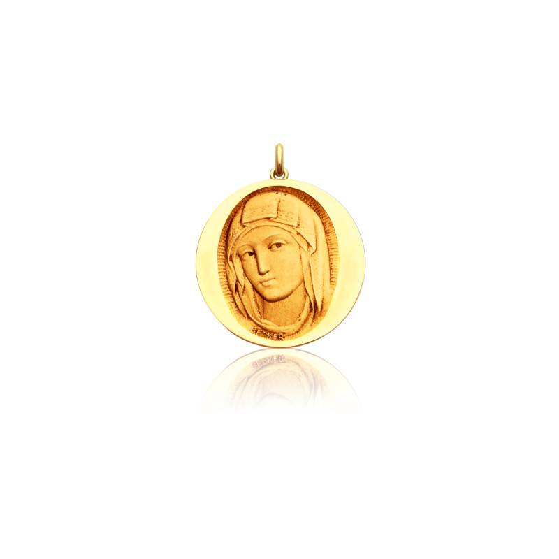 De forme ronde, cette médaille affiche en son centre une figure de la vierge Regina. En relief, celle-ci est voilée et auréolée. La finition soleillée vient souligner cette auréole, faisant ainsi resplendir la Sainte de mille feux et lui conférant une véritable aura divine. Les contours du bijou offrent une finition polie tranchant avec l'effet mat du motif. Une bélière vient compléter ce bijou ciglé du nom de la maison Becker pour plus d'authenticité.