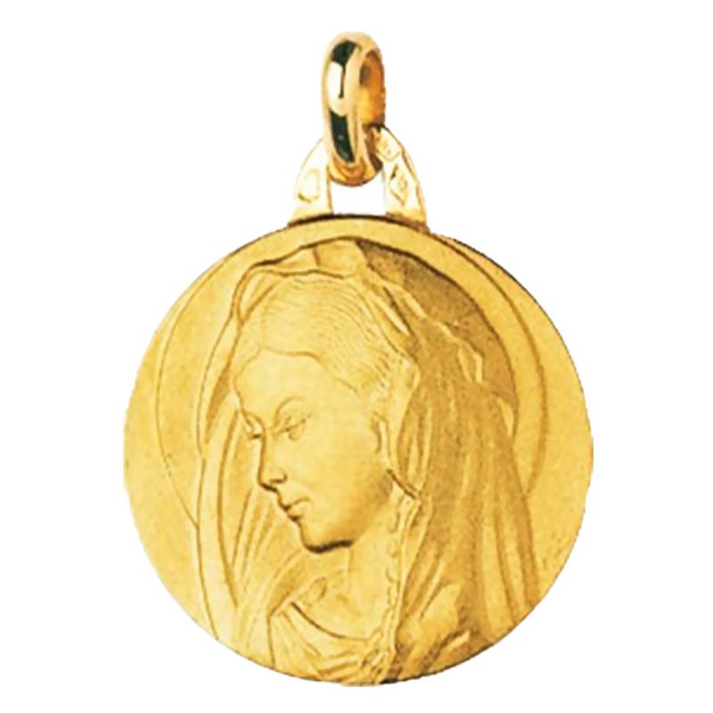 Découvrez la médaille Vierge italienne en or jaune 750/1000 (18K). Sur celle-ci est représentée la Vierge portant un voile délicatement plissé. Cette médaille est satinée et mesure 17 mm de diamètre.