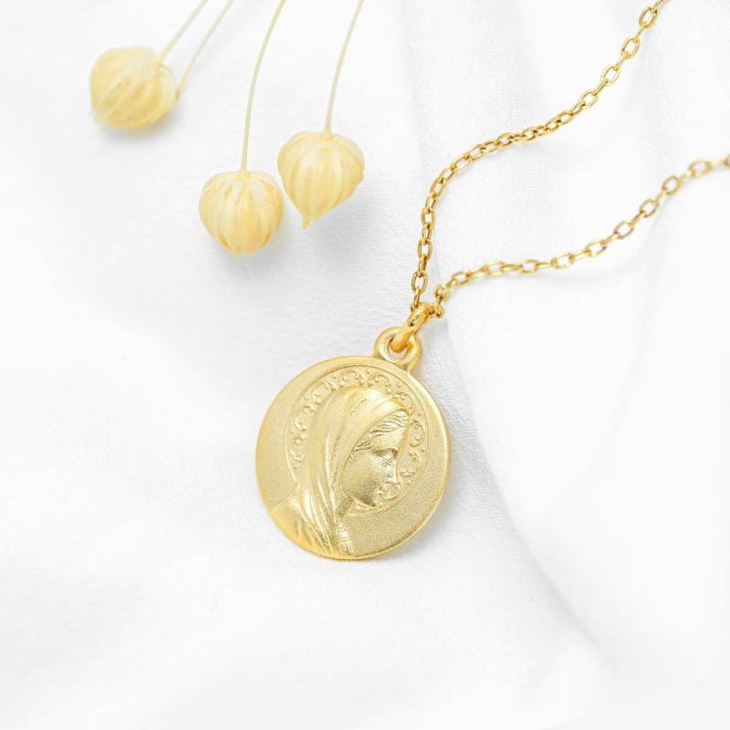 Elle représente le visage doux de la vierge Marie qui porte son voile et entourée par une auréole décorée par des motifs floraux. Minutieusement travaillée, cette médaille est disponible en deux tailles : une 16 mm de diamètre avec un poids de 1,70 gramme et une autre de 18 mm ayant un poids de 2,10 grammes.