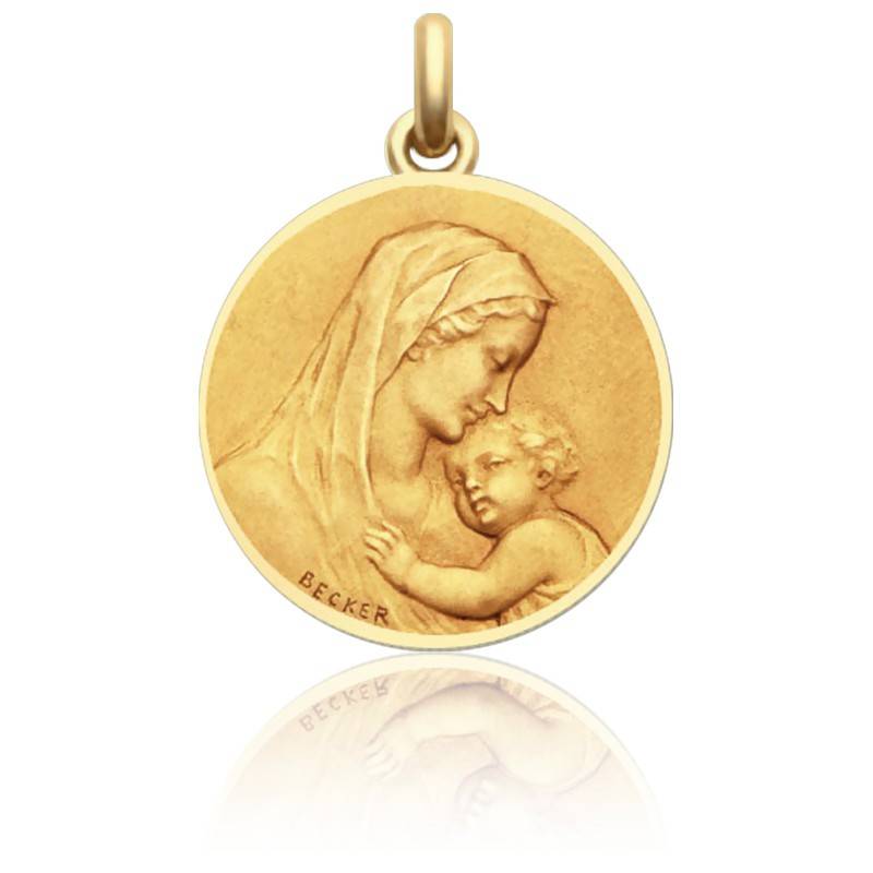 La maison Becker vous propose de découvrir son univers à travers cette charmante médaille. La Vierge à l'Enfant ou Madone est un thème récurrent dans l'art religieux. Elle renvoie à la naissance du Christ. Ici, la Vierge est représentée en avant, dans une attitude d'amour inconditionnel.